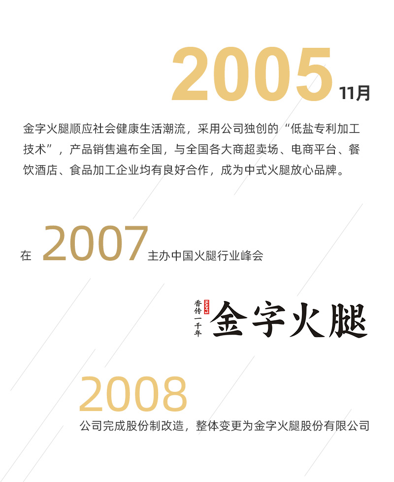 >金字火腿順應(yīng)社會(huì)健康生活潮流,采用公司獨(dú)創(chuàng)的“低鹽專利加工技術(shù)”,產(chǎn)品銷售遍布全國,與全國各大商超賣場(chǎng)、電商平臺(tái)、餐飲酒店、食品加工企業(yè)均有良好合作,成為中式火腿放心品牌。
